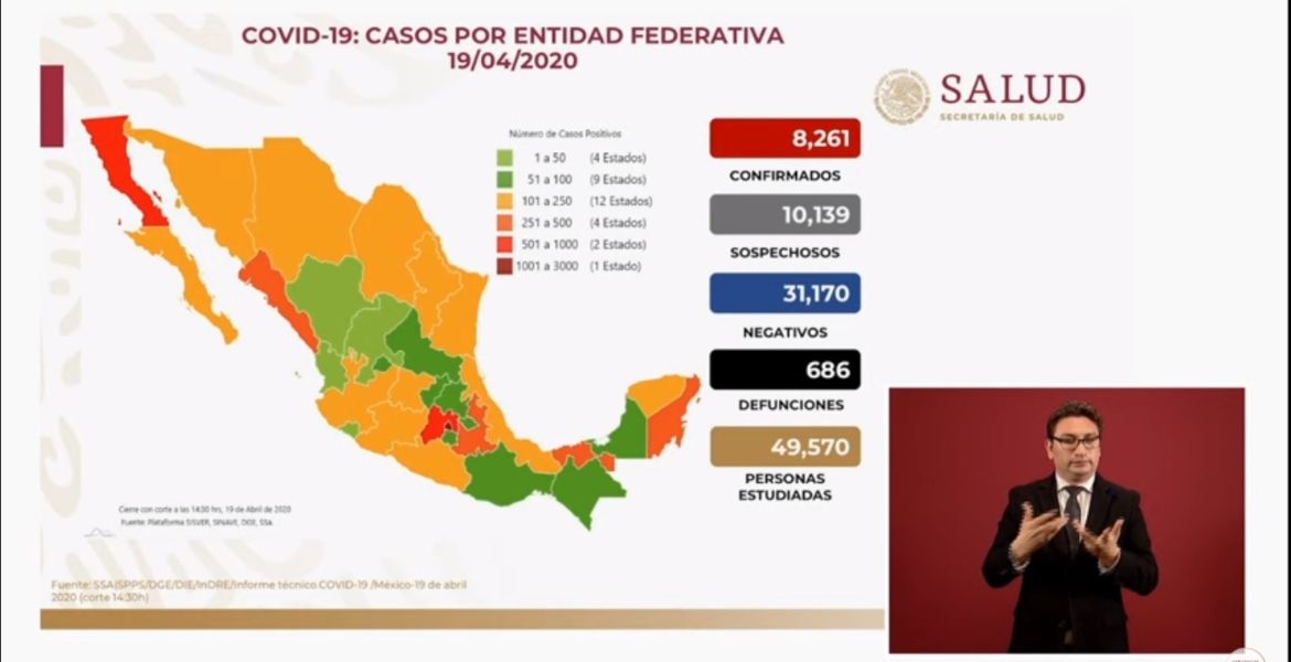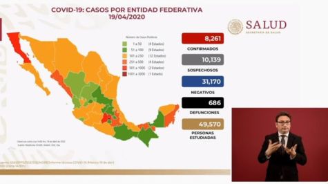Ciudad de México.- Durante la actualización de cifras por el Covid-19, Hugo López-Gatell Ramírez, subsecretario de Prevención y Promoción de la Salud, indicó que al corte de este domingo de las 14:30 horas, en México ya van 686 —ayer eran 36 menos— fallecidos y 8 mil 261 casos confirmados —hay 764 pacientes más que hace 24 horas—.