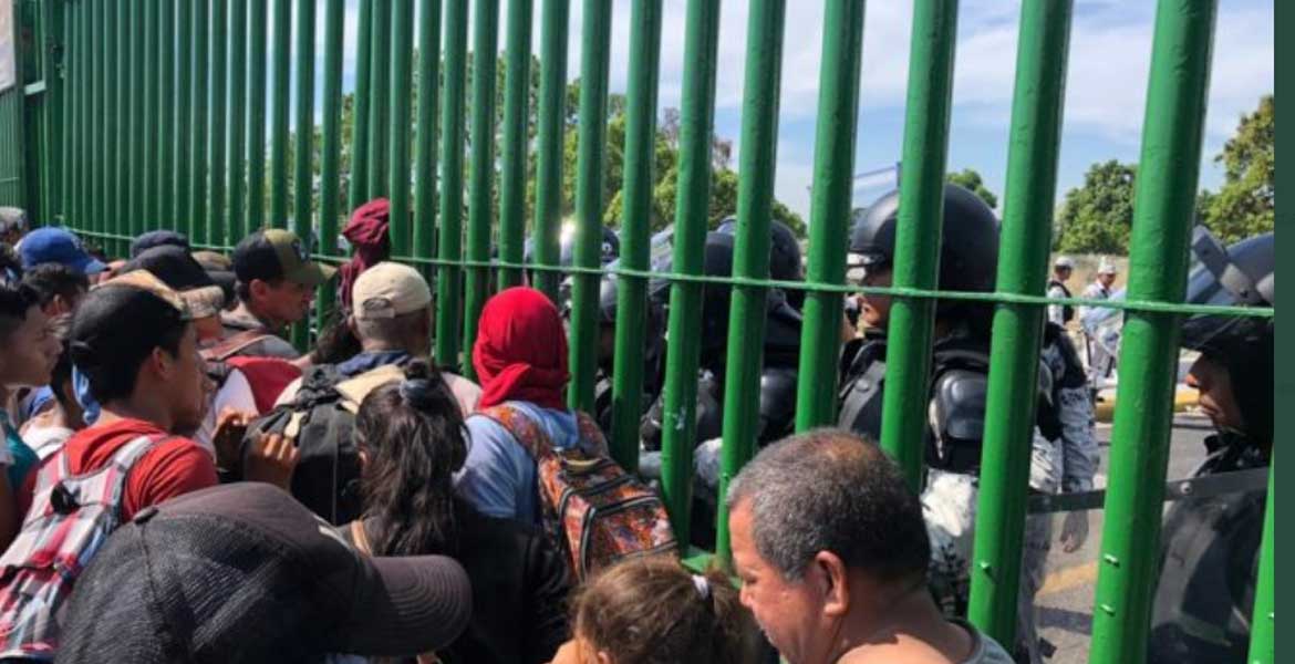 En la frontera de Guatemala con Chiapas, los extranjeros fueron recibidos con un cerco de la Guardia Nacional, mientras que hombres, mujeres y niños realizaron una cadena humana para avanzar hacia el puente fronterizo.