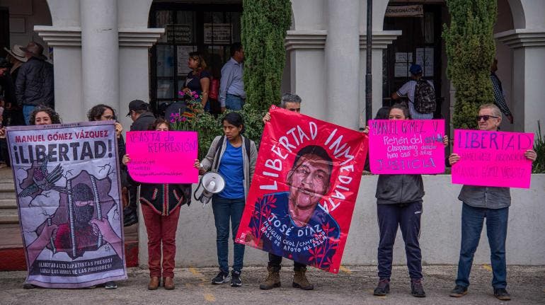 El Centro de Derechos Humanos Fray Bartolomé de Las Casas (Frayba), que también se manifestó, afirma que el activista, del pueblo maya-tseltal, "es criminalizado judicialmente por ser, junto a su familia, zapatista".