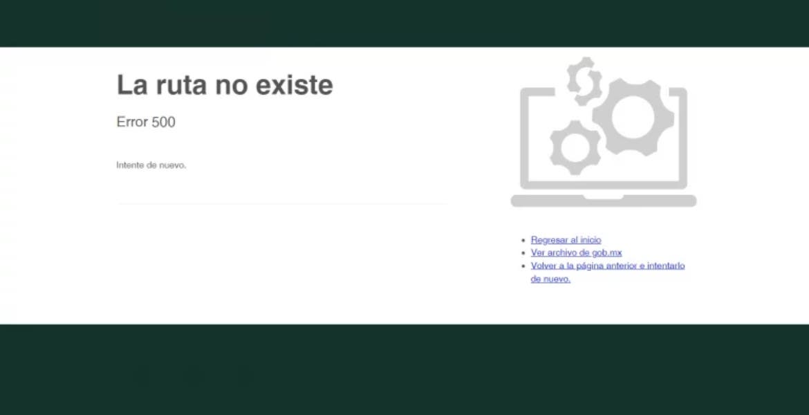 Cuando se intenta abrir alguno de estos portales, aparece la dirección https://failover.www.gob.mx/mantenimiento.html y el mensaje “La ruta no existe. Error 500”.