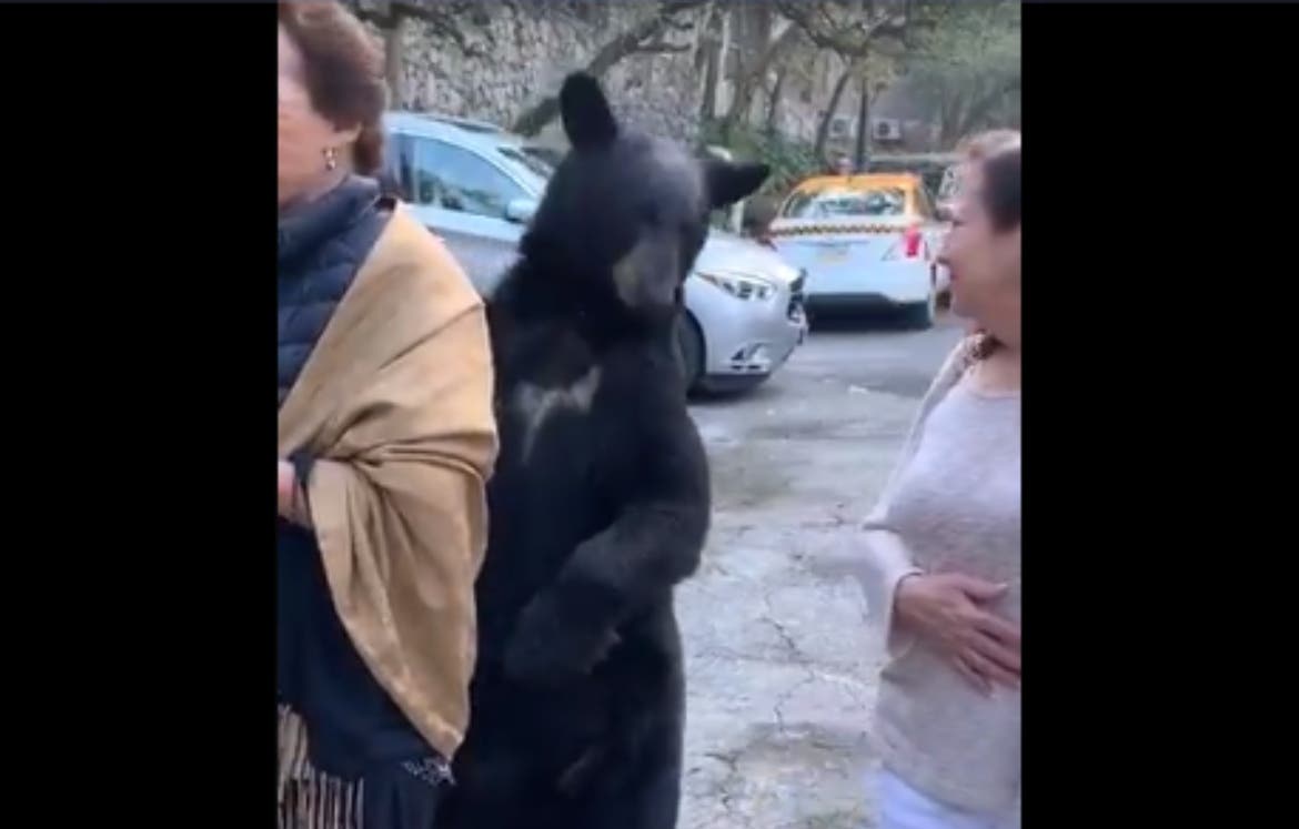 Un oso se pone a dos patas y toca el cabello de una mujer y, más tarde, se acerca a otra y le muerde.