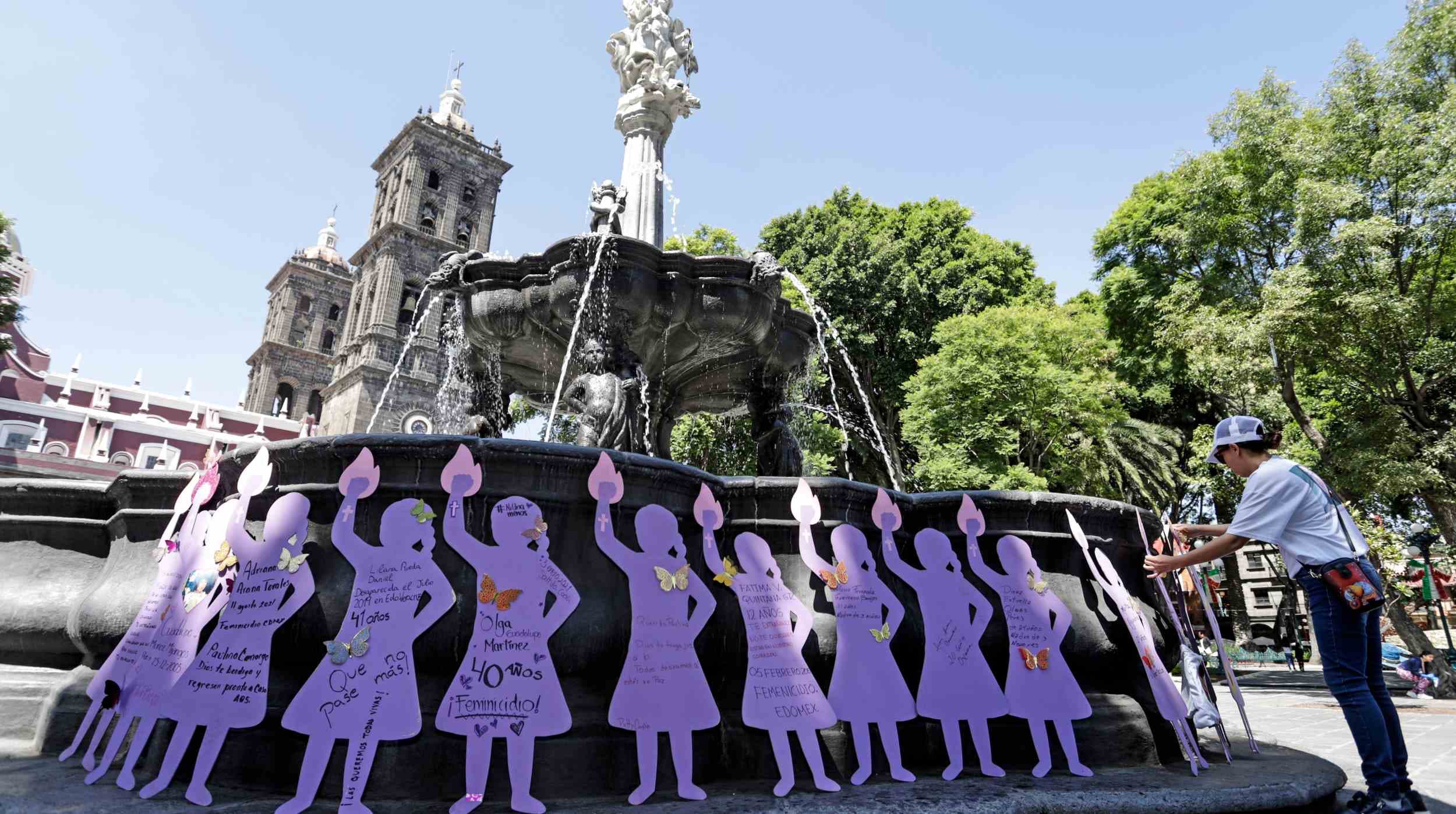 Puebla.- Madres y padres buscadores honran la memoria de sus hijas desaparecidas con la colocación de siluetas de madera en la plaza principal de la capital de Puebla.