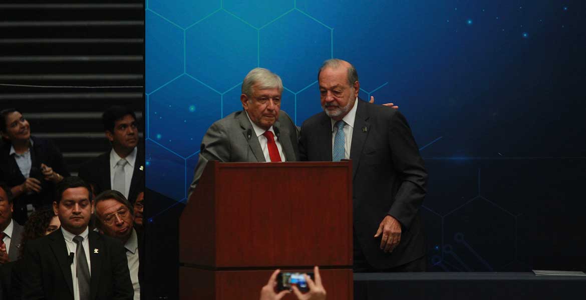 A su llegada al Palacio de Minería, López Obrador fue recibido por el empresario Slim Helú, y por el presidente de la Unión Mexicana de Asociaciones de Ingenieros, Salvador Landeros.
