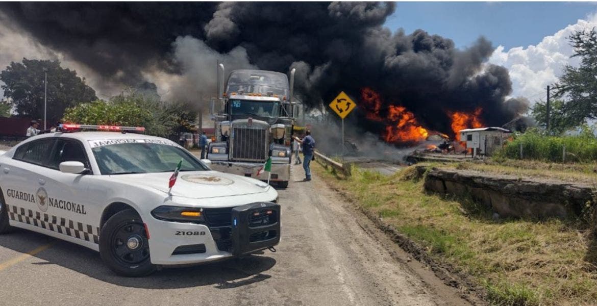 Personal de la #GuardiaNacional en coordinación con autoridades de #ProtecciónCivil establecieron los desvíos a la circulación y acordonamiento, ante el choque e incendio de una pipa cargada con combustible en Ciudad Guzmán, #Jalisco. pic.twitter.com/oD2bCQRqYx