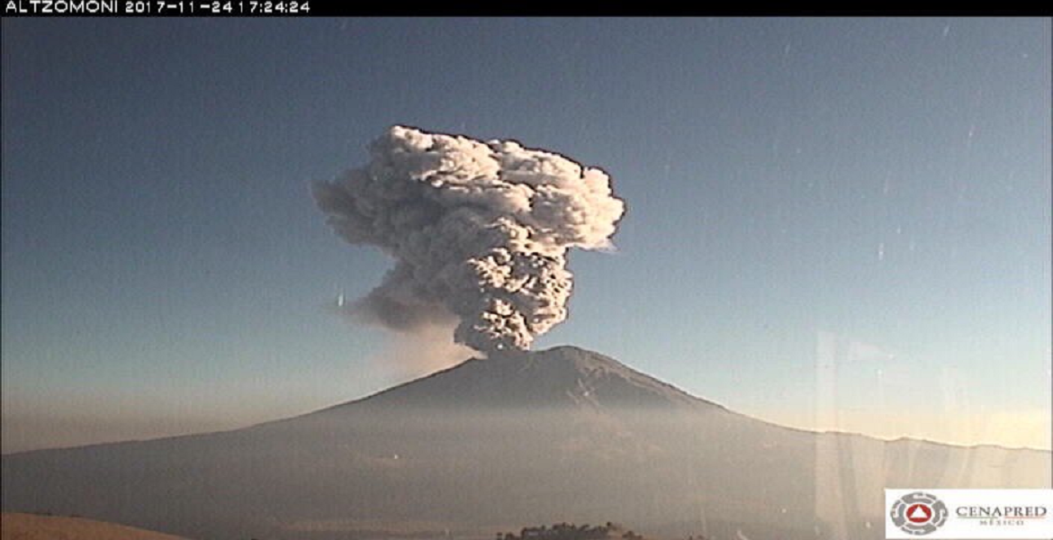 El Centro Nacional de Prevención de Desastres (Cenapred) difundió un video del momento exacto en que la fumarola fue expulsada por el volcán en punto de las 17:12 horas.