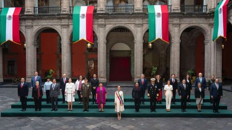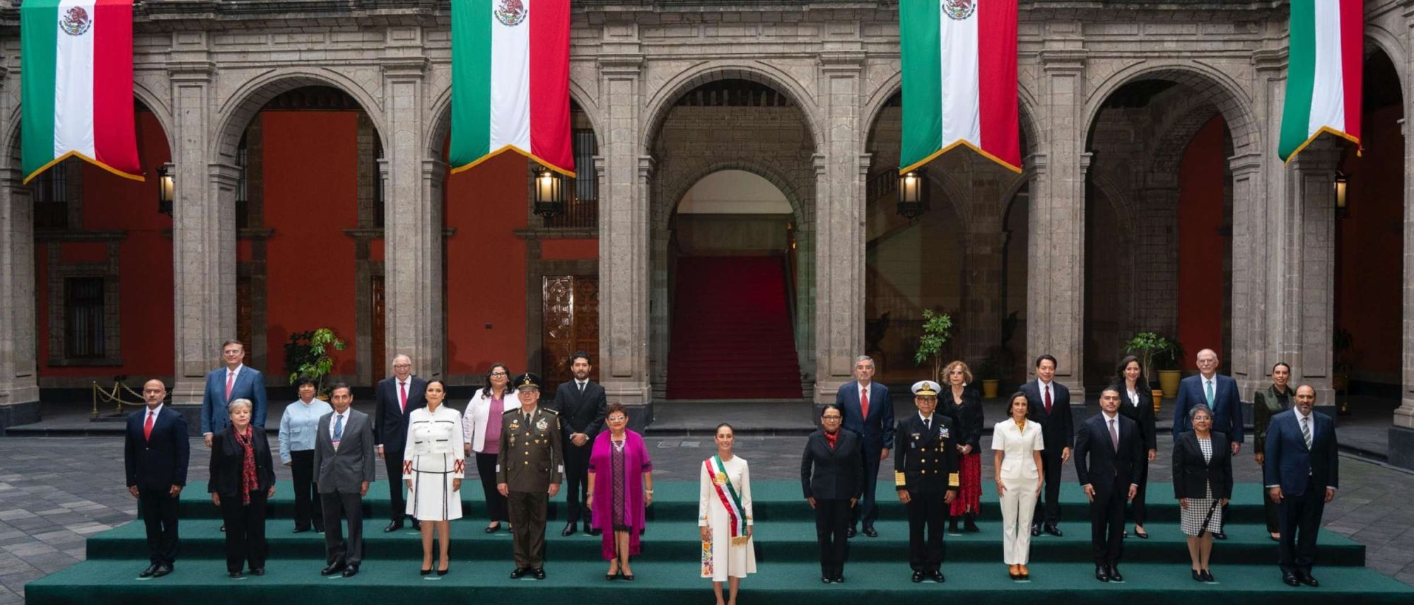 La imagen tomada en el centro del patio principal del Palacio Nacional, en medio de banderas tricolor a su alrededor, muestra a los 19 titulares de las tradicionales secretarías del Gobierno mexicano, entre otros miembros de su nuevo gabinete, que añadirá a la Secretaría de las Mujeres y la de Ciencia.