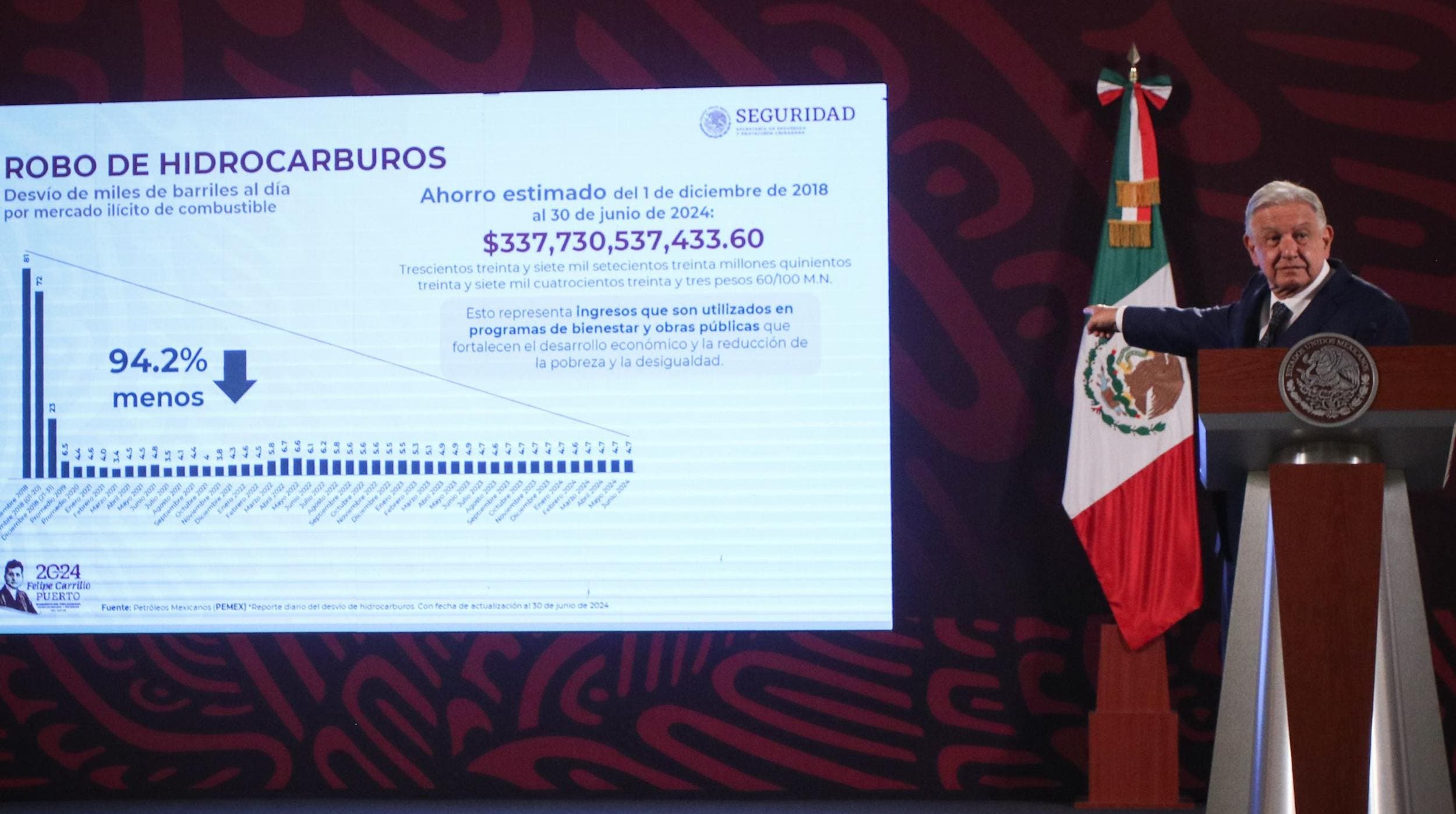 De esta forma, López Obrador mostró una lámina, en la cual expuso que se han ahorrado 337 mil 730 mdp debido al combate de huachicol que puso en marcha su gobierno desde el inicio del sexenio, es decir, en diciembre de 2018.