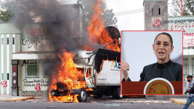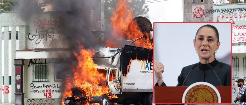 La reacción de Sheinbaum ocurre luego de que el jueves, como parte de las movilizaciones de cara al aniversario 11 de la desaparición de los 43 estudiantes de la Escuela Normal Rural Raúl Isidro Burgos, una decena de activistas realizaran pintas, lanzaran explosivos y dirigieran un camión de carga a la puerta del recinto que lograron derribar.