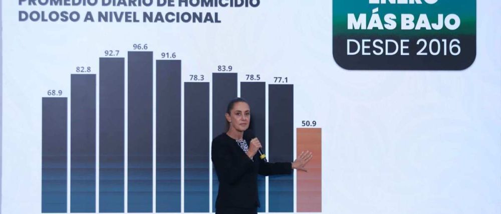“42 % de reducción en homicidios dolosos de septiembre de 2024 a enero de 2026. Eso significa 36 homicidios diarios menos”, señaló la mandataria durante su conferencia de prensa matutina.