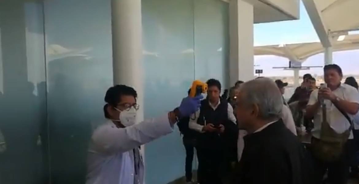 A su llegada a Oaxaca para inaugurar el hospital de Tlaxiaco, AMLO cumplió con los procedimientos sanitarios del aeropuerto. Su temperatura fue de 35.6 grados@lopezobrador_ | @SSalud_mx | @HLGatell