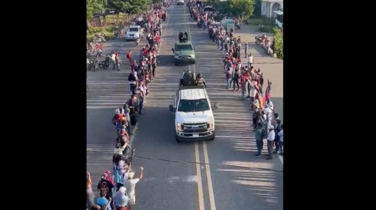 Videos compartidos en redes sociales muestran el momento en que un grupo de personas aplauden y gritan: “vamos con todo”, al tiempo que los sujetos con equipo bélico van sonando los cláxones de sus unidades.