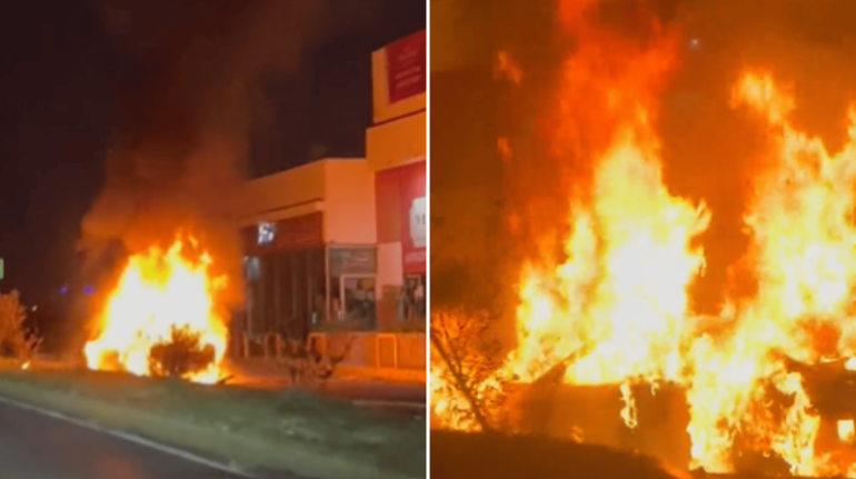 En redes sociales se compartieron imágenes del accidente, en el que se ve un vehículo envuelto en llamas, a un lado del camino.