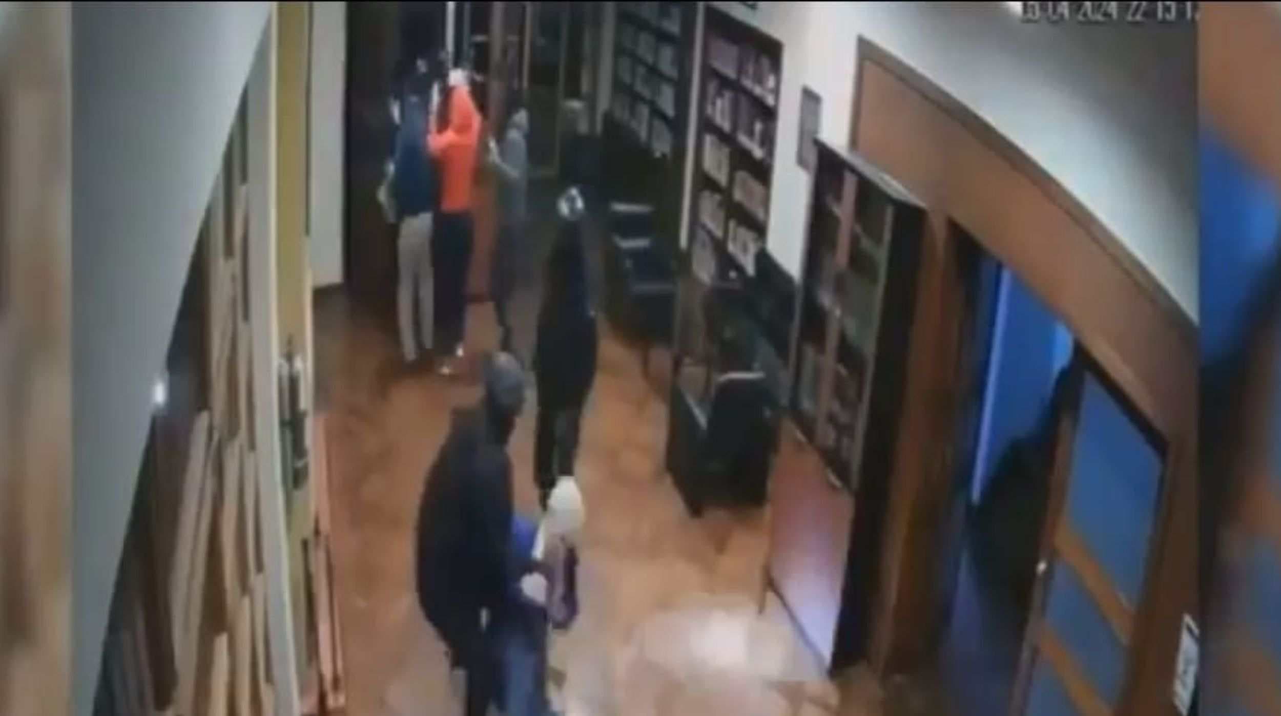 En la grabación se observa como el personal de las fuerzas de seguridad de Ecuador ingresan sin autorización a las instalaciones, en la imagen aparece Roberto Canseco, jefe de cancillería, quien intenta detenerlos, sin embargo, este es sometido y encañonado por un agente de seguridad.