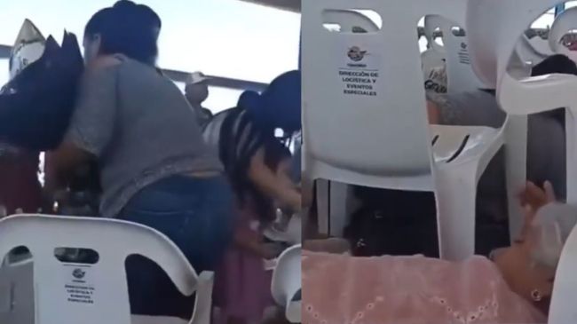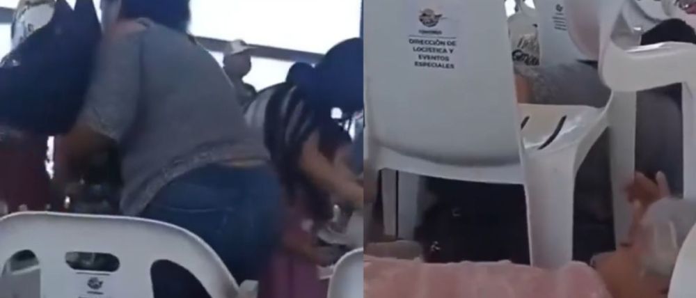 “A ver, igual, seguimos igual. Tranquilos. Nadie se levanta, por favor”, se escucha decir a los organizadores, mientras personas intentan resguardarse entre las sillas colocadas para el acto académico.