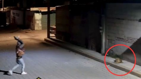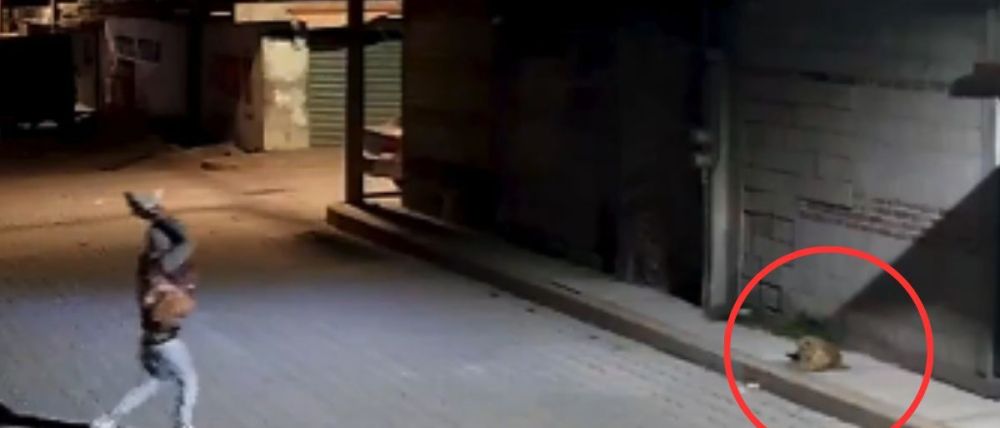 En la grabación, de un minuto de duración, se observa a un hombre vestido con una sudadera gris con gorro, pantalón de mezclilla, tenis blancos y mochila rosa caminando por la calle. Luego de notar la presencia del perro, que dormía sobre la banqueta, el sujeto voltea hacia un montón de grava y piedras de gran tamaño, se acerca y toma una con ambas manos.