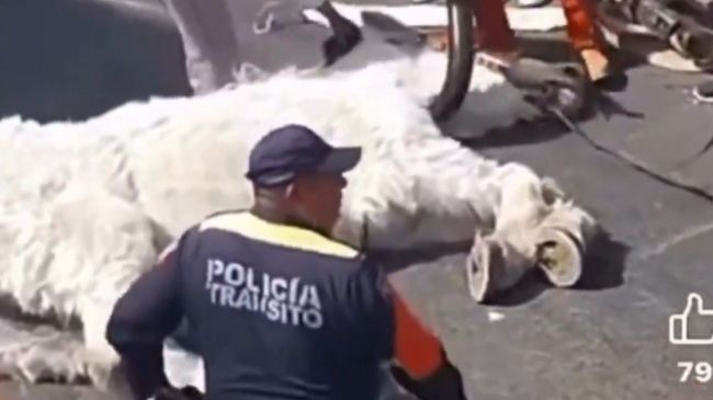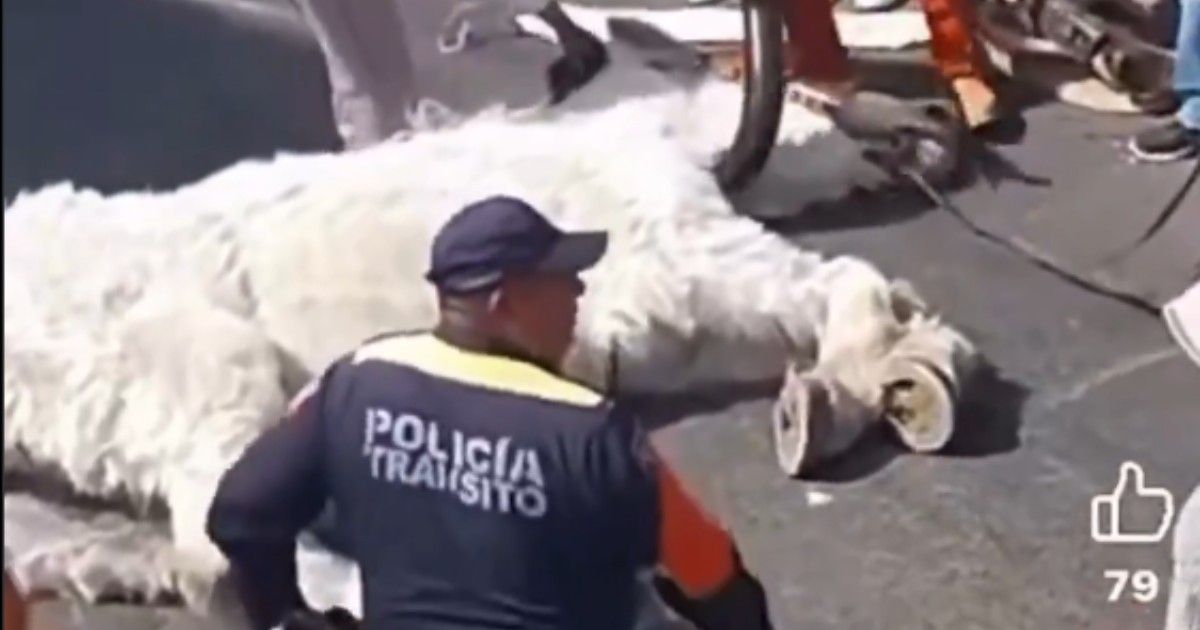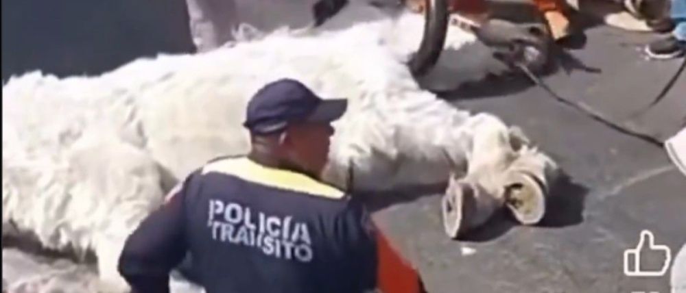En la grabación de un minuto y 25 segundos se observa al equino de color blanco tirado sobre el pavimento, rodeado de varias personas, entre ellas un elemento de la Policía de Tránsito.