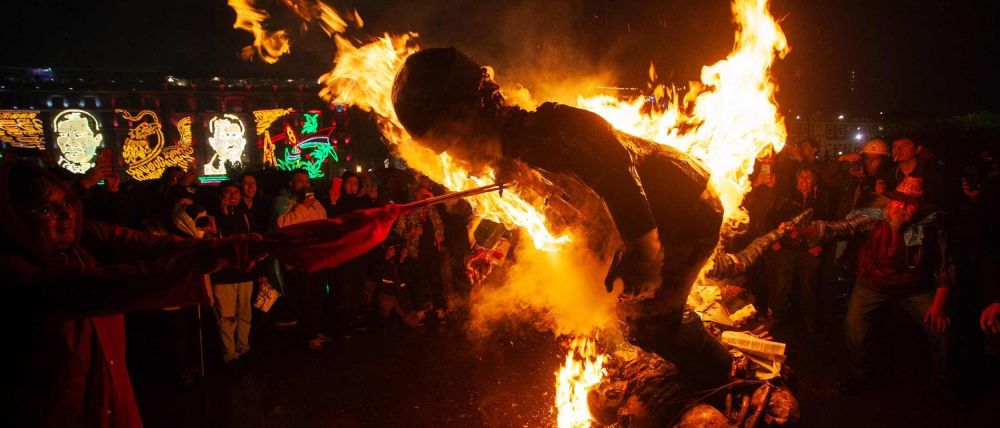 Mientras se desarrolla el mitin en el Zócalo por los 10 años del caso Ayotiznapa, en una parte de la plancha se quema la figura de un soldado, mientras los asistentes del hecho hacen un pase de lista de los 43.https://t.co/A5lNPgqJMS