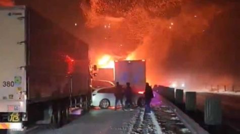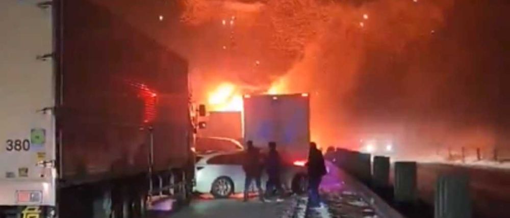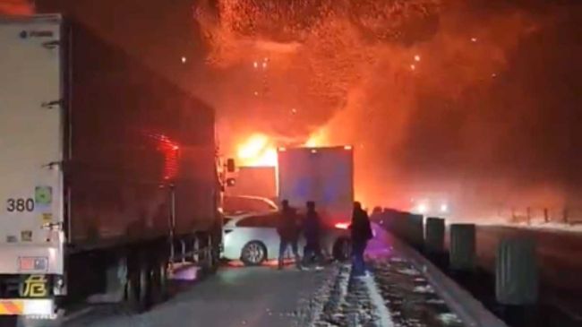 Según la cadena pública, más de 50 vehículos colisionaron posteriormente contra los camiones, y una decena de ellos se incendió.
