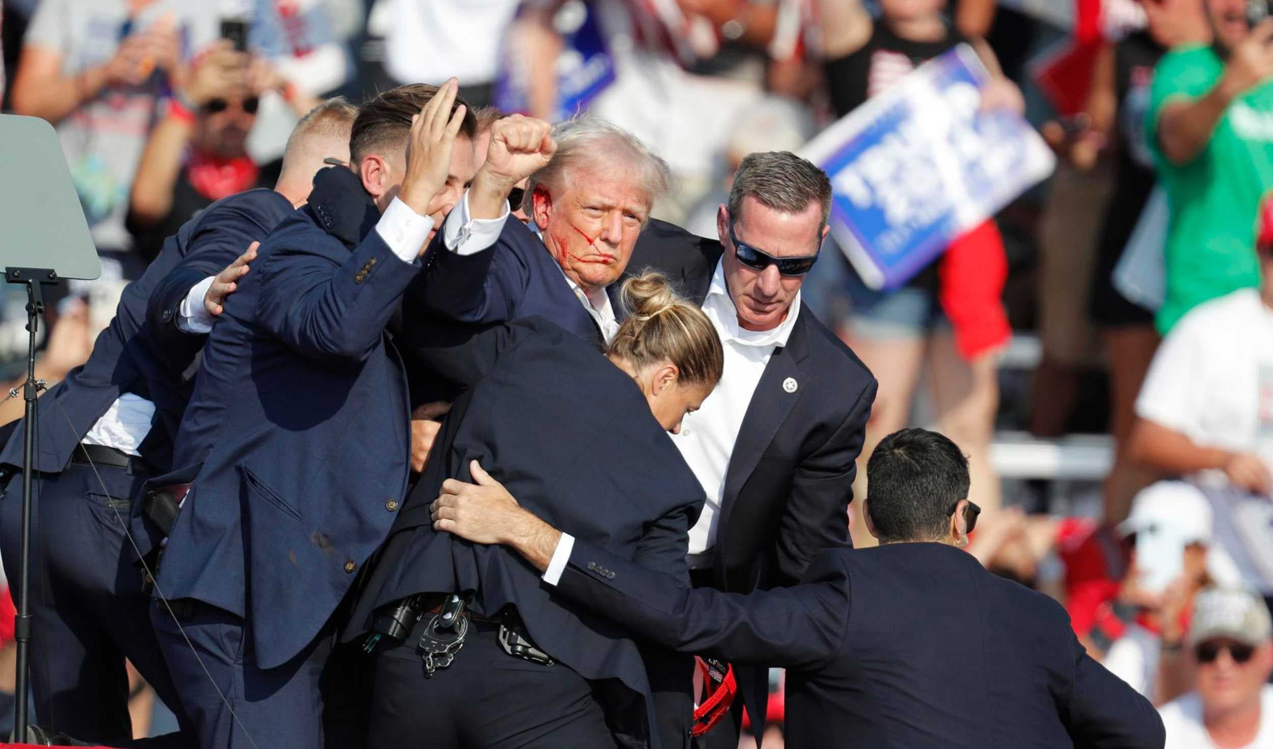 Tras oírse los disparos, Trump fue evacuado rápidamente del escenario con sangre en la oreja derecha y parte de la cara. Poco después, su campaña informó de que el republicano se encuentra "bien".