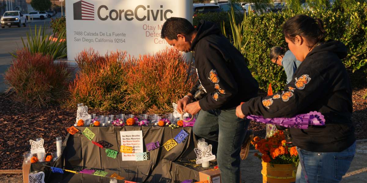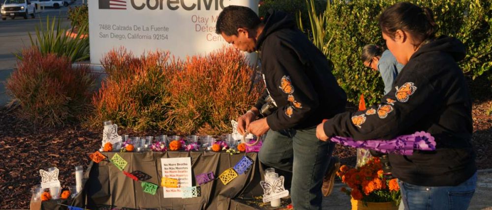 Altares adornados con las tradicionales flores anaranjadas de cempazuchitl, velas y pan de muertos se replicaron frente a las entradas de un buen número de centros de detención de ICE, manejados en su mayoría por compañías privadas como CoreCivic, que administra la cárcel migratoria de Otay Mesa, ubicado en la frontera de California y México.