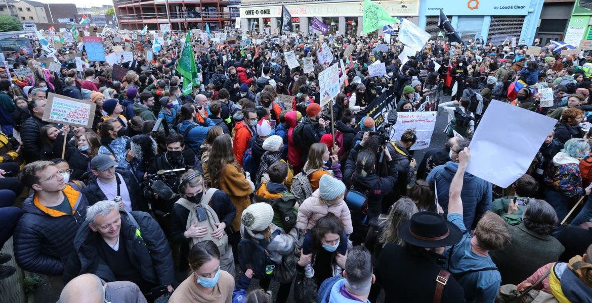 Los manifestantes -25 mil según FFF y miles según fuentes policiales- gritaban alborozados cuando los breves rayos de sol que se filtraban entre las nubes que cubrían este viernes el cielo escocés iluminaban el colorido bosque de pancartas de cartón que encabezaba la marcha, lugar reservado a los indígenas.