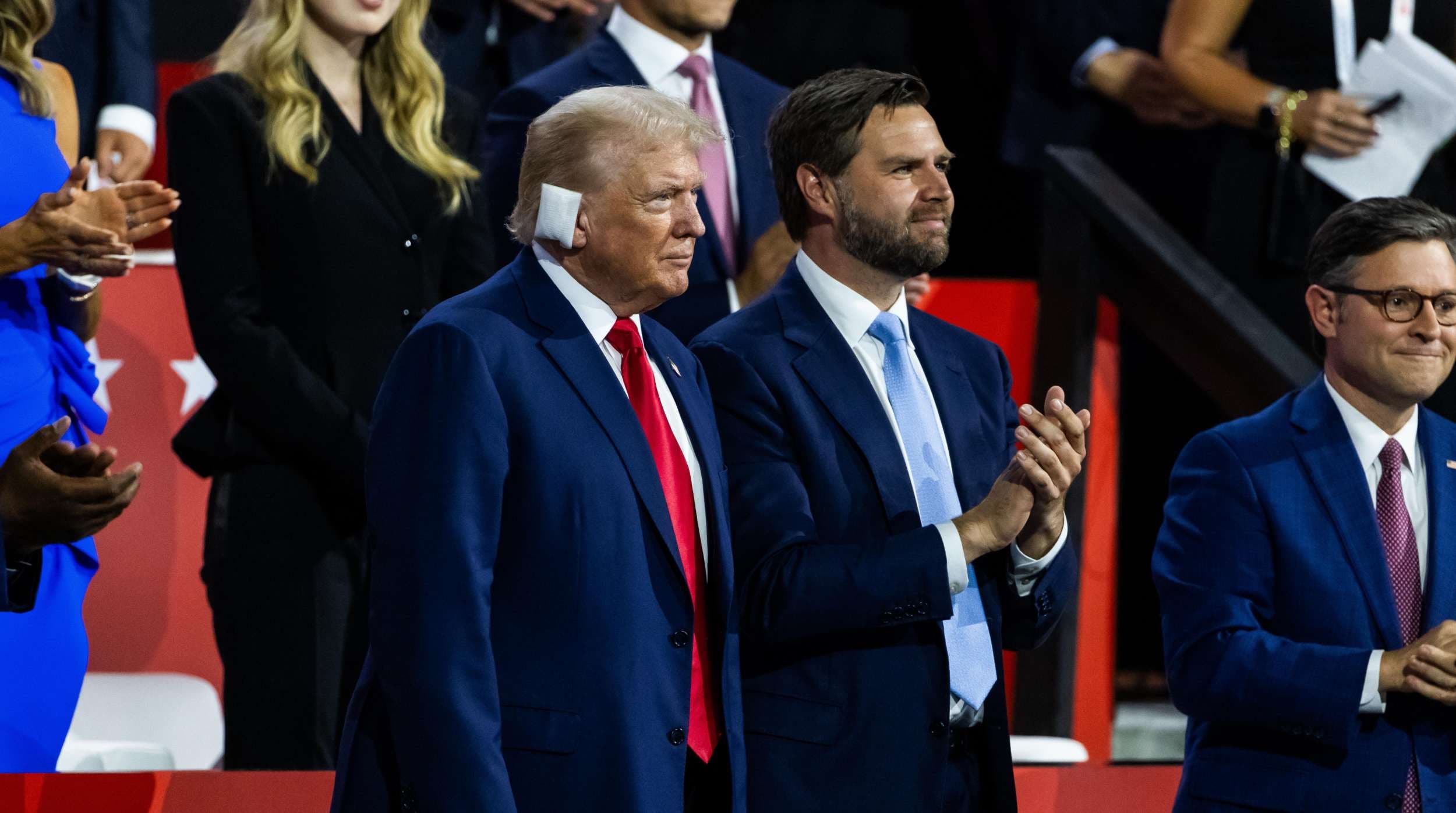 Primera aparición pública de Donald Trump tras el intento de asesinato. Con la oreja vendada, Trump es recibido en la convención republicana con una larga ovación del auditorio, que corea “USA!”. Le acompaña su familia y su recién elegido candidato a la vicepresidencia, JD Vance. pic.twitter.com/YB8jiBxGKa