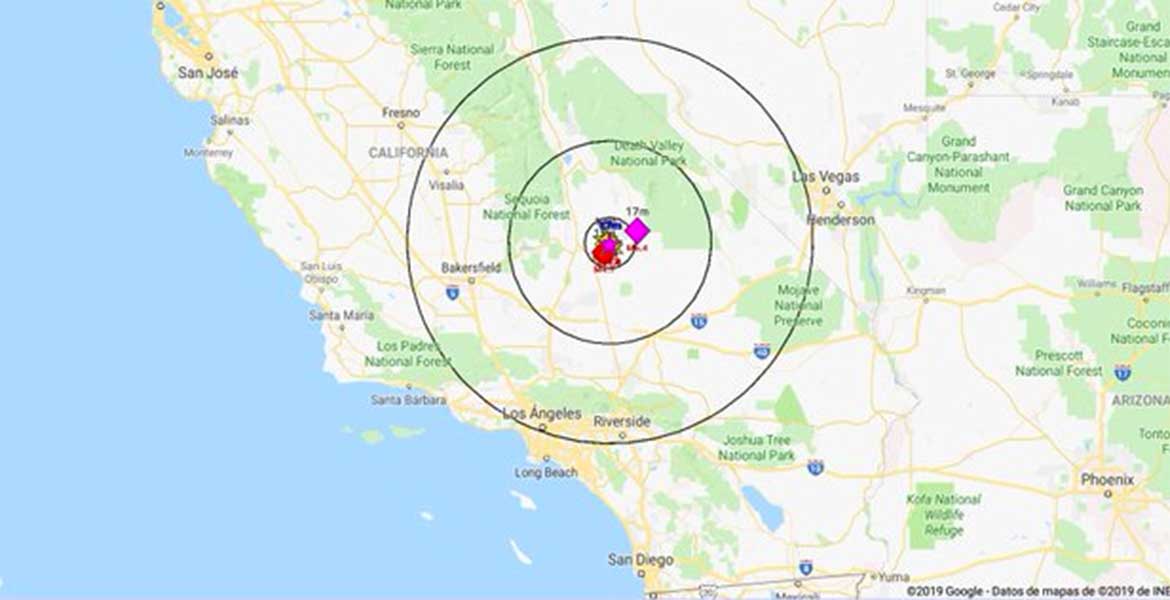 El Servicio Geológico de Estados Unidos (USGS, por sus siglas en inglés) informó que el epicentro del movimiento telúrico se presentó a las 10:33 horas locales a una profundidad de 8.7 kilómetros, en Ridgecrest, a 250 kilómetros de Los Ángeles.