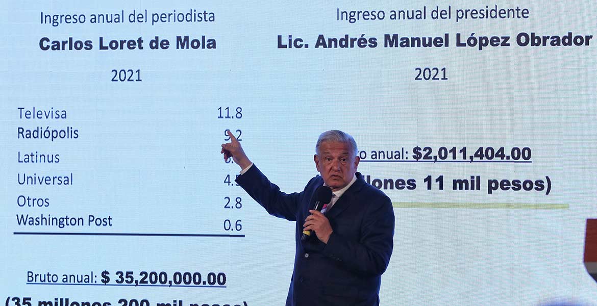A pesar de las consideraciones difundidas por el Consejo Consultivo del Inai de que es violatorio a la ley del Estado exponer información fiscal de personas físicas, López Obrador presentó por cuarto día consecutivo el desglose de recursos económicos millonarios que presuntamente obtuvo Loret de Mola durante 2021 de varios medios de comunicación.