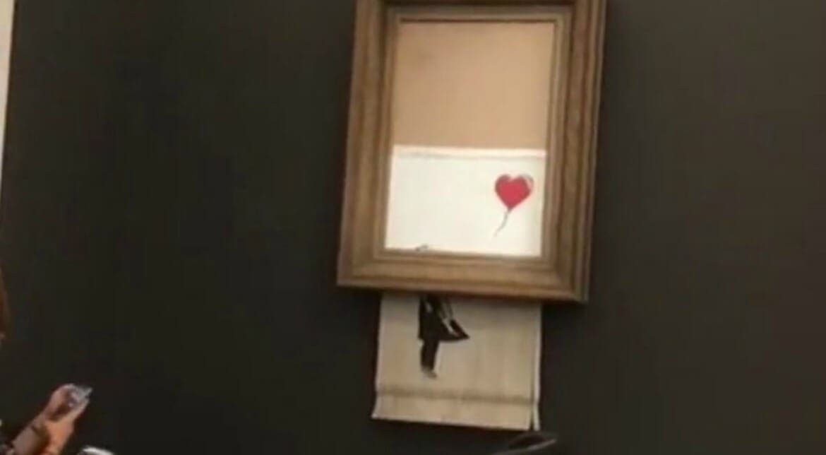 La obra, "Girl With Balloon" (Niña con globo), del anónimo artista del grafiti se hizo trizas tras ser vendida, por una trituradora de papel oculta en la parte inferior del marco.