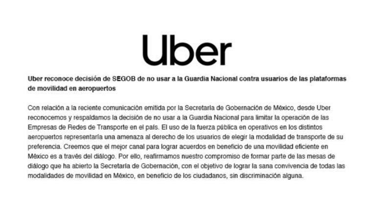 En su cuenta oficial de Twitter,  la plataforma de transporte privado UBER reconoció y respaldó la decisión de la SEGOB de no movilizar a la Guardia Nacional en operativos en aeropuertos del país.