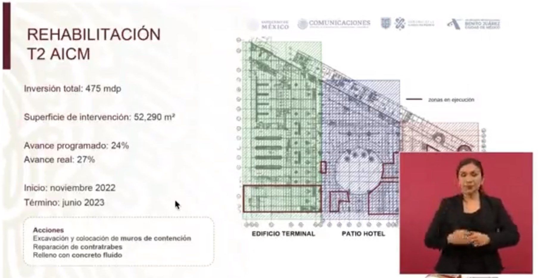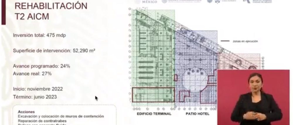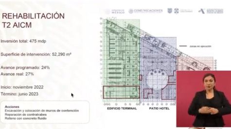 Ciudad de México.- En conferencia matutina con el Presidente Andrés Manuel López Obrador, la Jefa de Gobierno, Claudia Sheinbaum Pardo, presentó los avances de la rehabilitación y reforzamiento del Aeropuerto Internacional de la Ciudad de México (AICM), en específico de la Terminal 2 a cargo de su administración, que lleva un avance real del 27 por ciento entre acciones de excavación y colocación de muros de contención, reparación de grietas en contratrabes, relleno con concreto fluido para atender el hundimiento del suelo.
