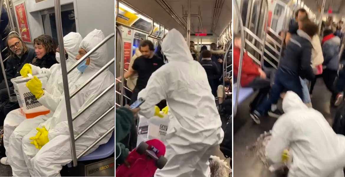 Nueva York.- En un vagón del Metro de Nueva York se desató el pánico, luego de que dos sujetos vestidos con trajes especiales de laboratorio médico destaparan una caja donde dijeron traían muestras del coronavirus COVID-19.