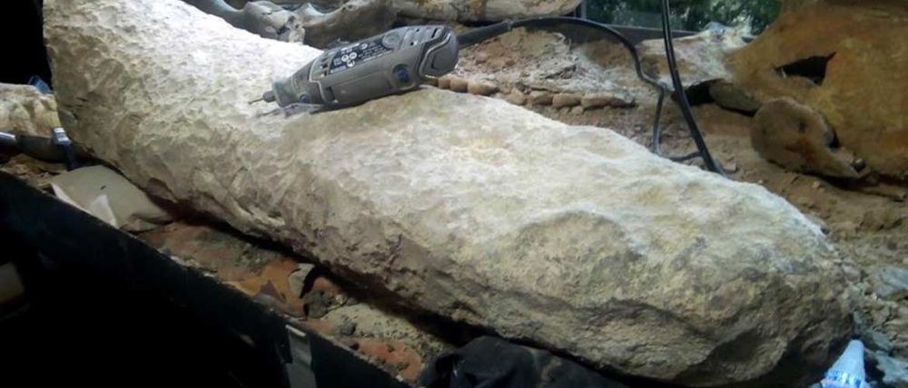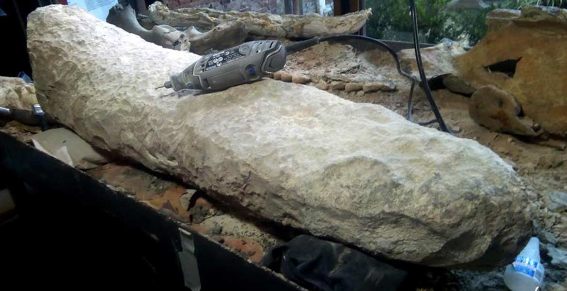 El hallazgo se produjo cuando el operario Fausto Capre estaba excavando con su máquina a unos 10 metros de profundidad en una cantera, y observó un objeto que le llamó la atención, ante lo que llamó a un equipo de paleontólogos que confirmó la naturaleza de la pieza, que tiene cerca de un metro de longitud y pesa 43 kilogramos.