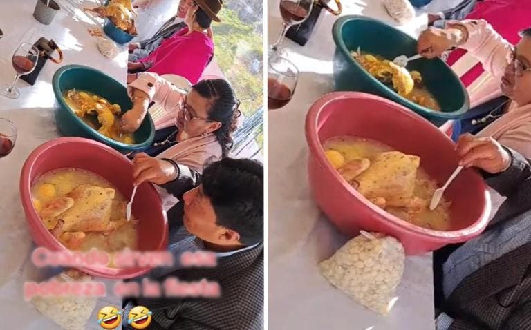 El video fue compartido por el usuario @edisonnoboa29 y ha causado sorpresa y asombro entre los usuarios de la plataforma. En las imágenes, se puede ver a los invitados disfrutando del caldo de pollo en tinas, en lugar de los platos hondos convencionales utilizados para esta preparación en otras culturas, como en México.