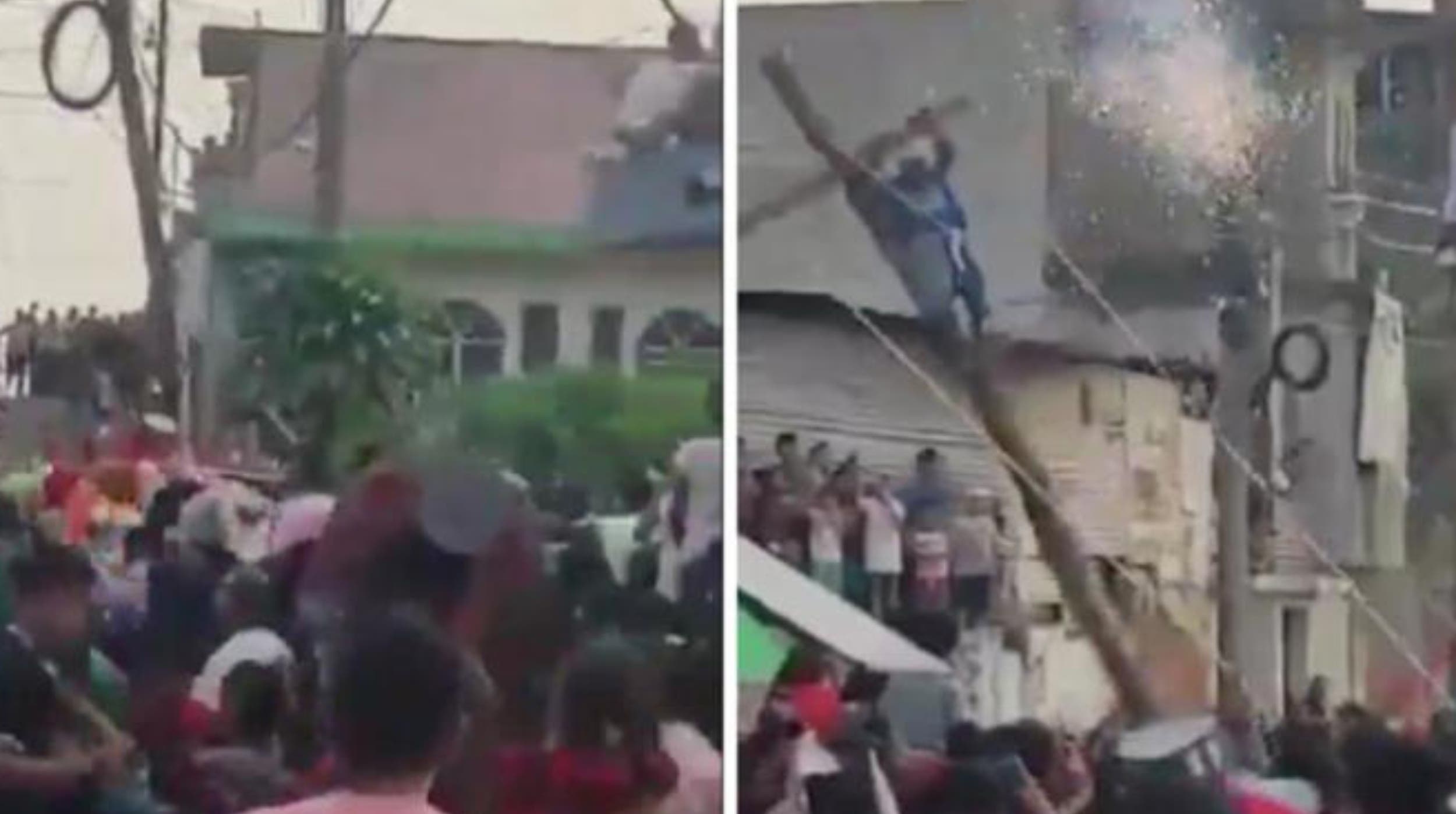 El incidente, que ha causado conmoción tanto a nivel local como en redes sociales, ocurrió debido a un descuido de los organizadores. Mientras llevaban la cruz para erigirla y simular la crucifixión, uno de los extremos de la cruz rozó accidentalmente con cables de alta tensión, generando una descarga eléctrica inmediata que fue acompañada de chispas visibles, tal como muestran imágenes difundidas en internet.