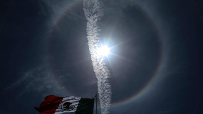 Ciudad de México.- Un halo multicolor rodea el sol este sábado y es visible en la Ciudad de México, situación que ha provocado el embelesamiento de cientos de capitalinos, quienes se han detenido para poder fotografiarlo.