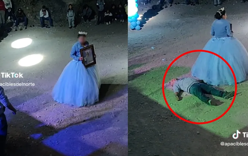 En un video que se ha viralizado en las redes sociales, se puede ver a la joven vestida con un hermoso vestido azul y acompañada por un cuadro que parecía representar a un miembro de la familia que había fallecido. Mientras bailaba, un hombre apareció tambaleándose y tropezó con la joven, terminando tirado a sus pies.