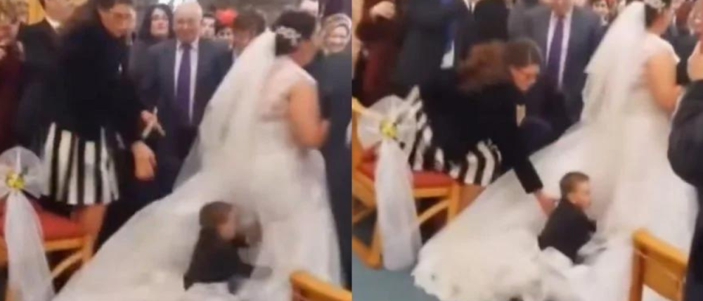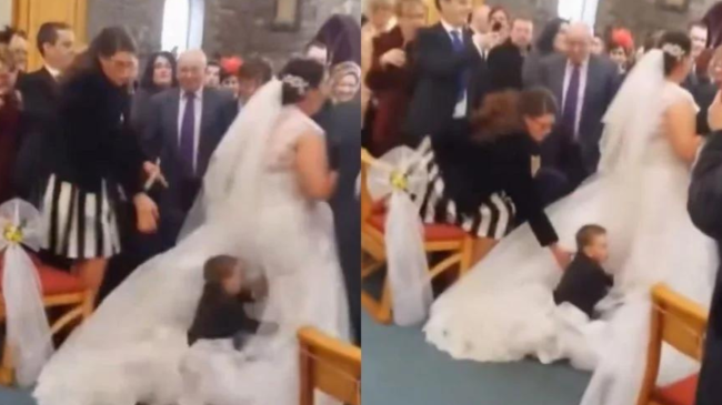 En la grabación se aprecia a la novia entrando a la parroquia tomada del brazo de su padre, cuando de pronto el menor entra corriendo y salta al vestido de la mujer, robándose la atención de todos los invitados de la boda.